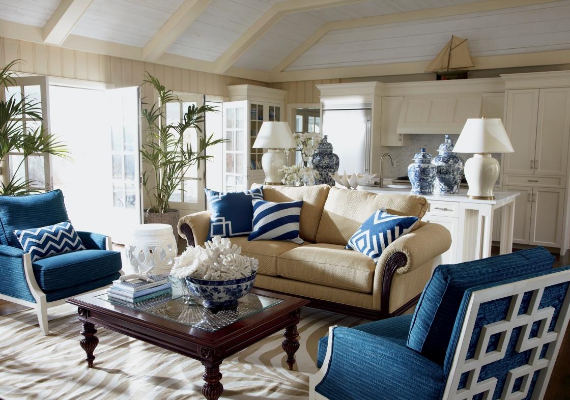 Незаменимым атрибутом может стать панно из ракушек или деревянные светильники. Дополнительно декорируется комната с помощью живых комнатных растений.