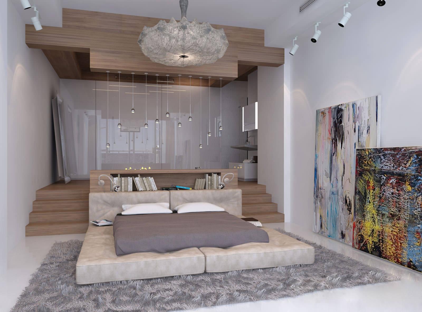 Фактурными дополнениями можно выделить не только элементы на стенах, и полу, но и на потолке. Нельзя делать в одном цвете все три поверхности, иначе они сольются друг с другом, и сделают интерьер спальни невыразительным. Основное правило для потолков — это выбор светлой палитры, лучше, если вы отдадите предпочтение белому глянцевому потолку. Хотя цвет слоновой кости тоже смотрится неплохо.