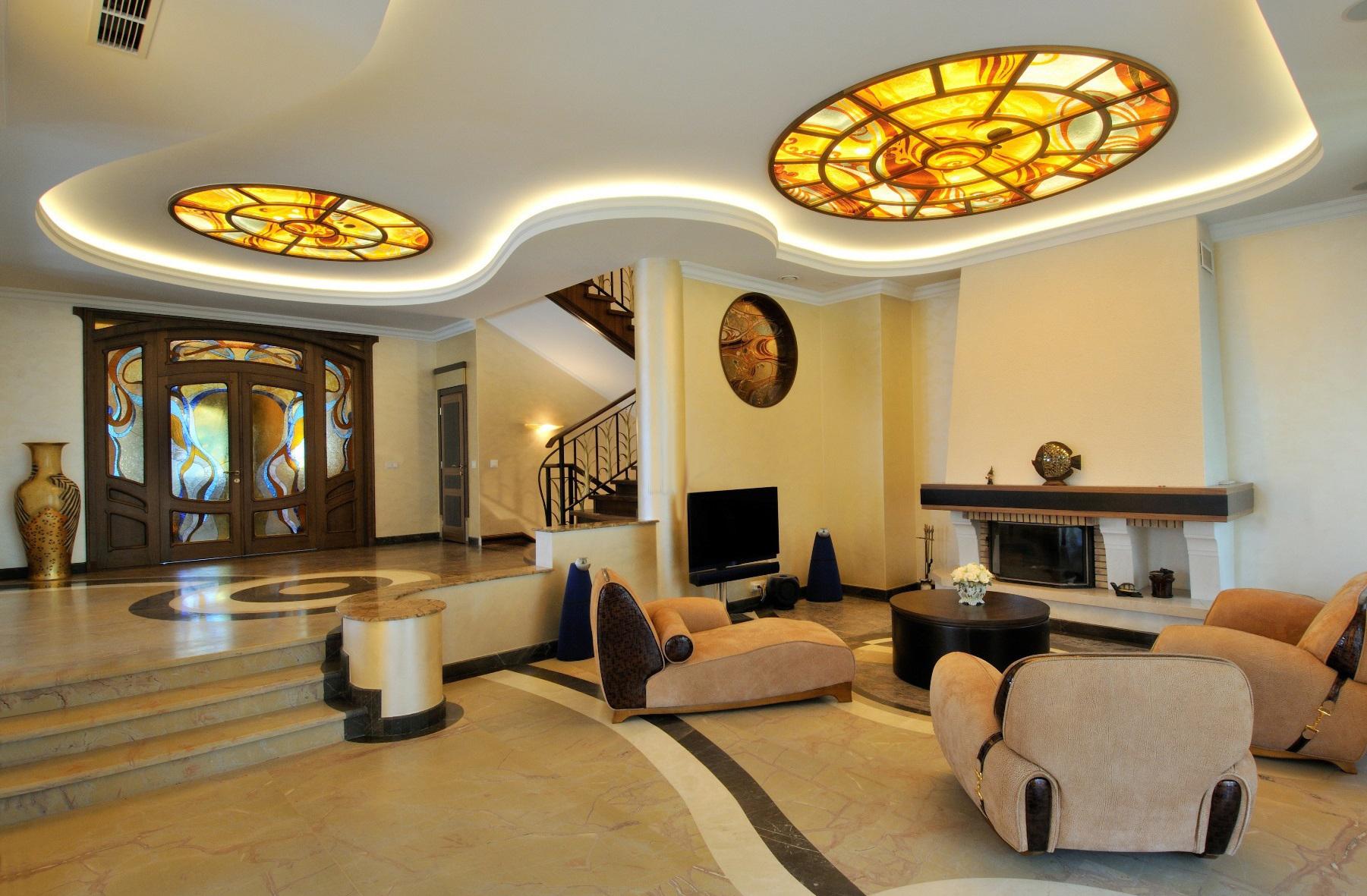 В качестве украшения потолка используют элементы лепнины, которая присутствует и на карнизах стен. Но даже без них, комната выглядит привлекательной и просторной, так как бежевый цвет располагает к этому.