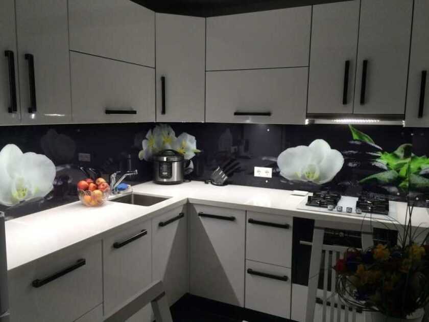 Необычным вариантом отделки фартука является стекло . При этом оно должно быть минимум 6 мм в толщину. Это обеспечивает высокий уровень прочности. Фартуки из стекла смотрятся красиво и необычно благодаря использованию специфичной технологии нанесения краски или методики фотопечати. Это обеспечивает широкое многообразие вариантов.