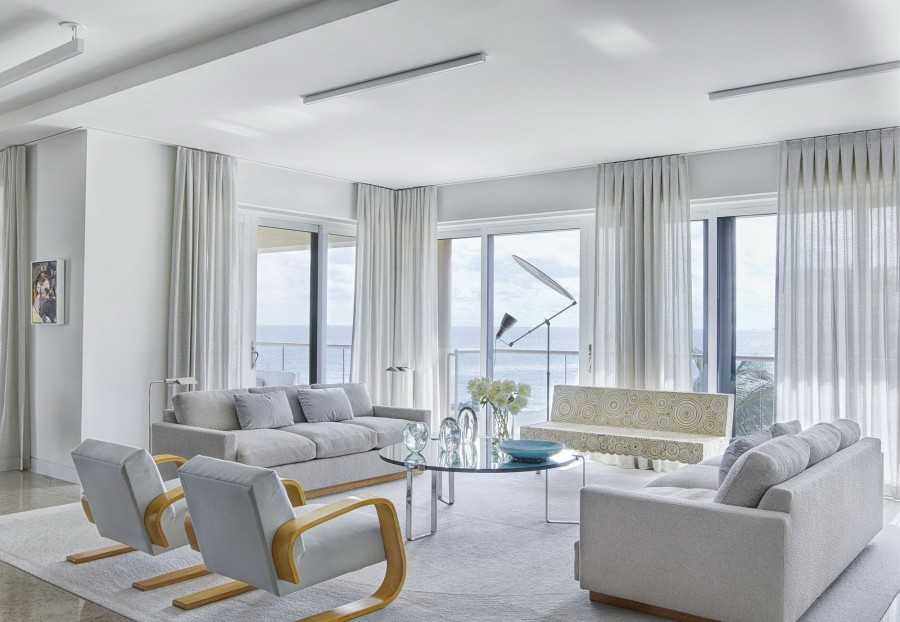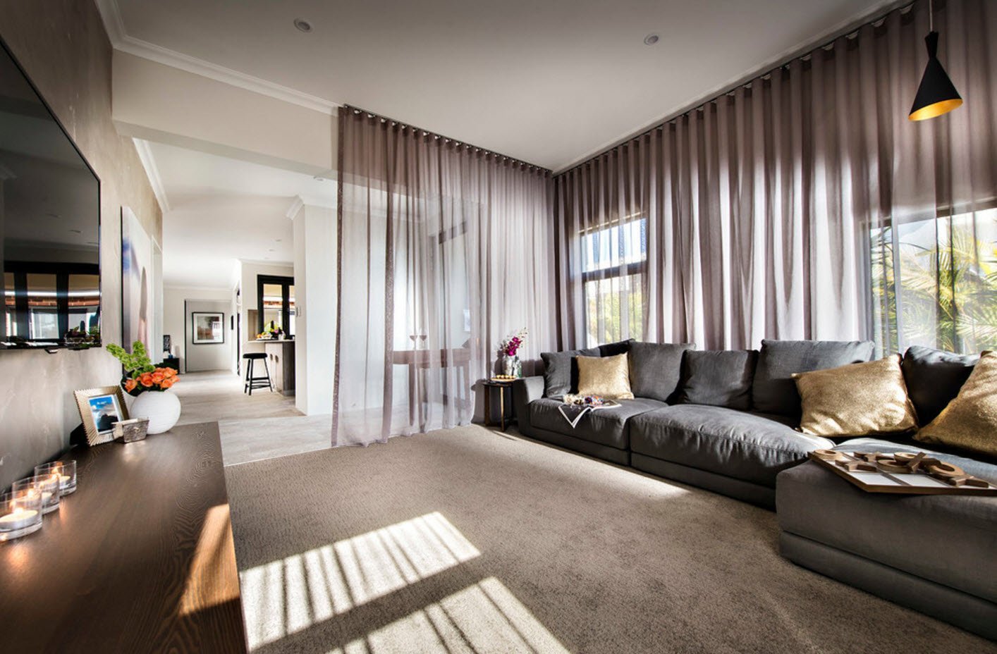 Белые шторы длиной до пола придают изысканный вид этой просторной гостиной.