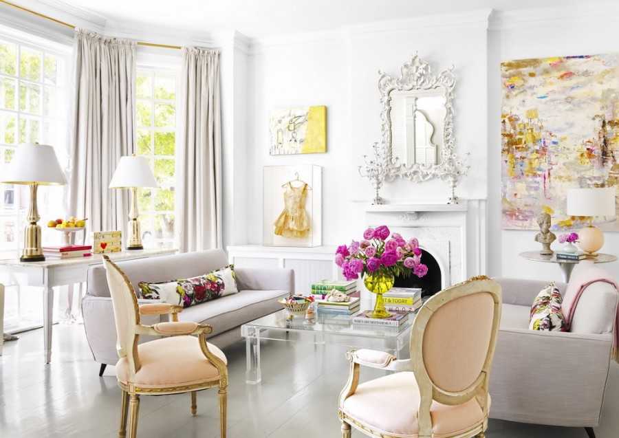Не совсем белые оттенки шаров и смешанные цветочные штрихи придают драматичности этой гостиной.