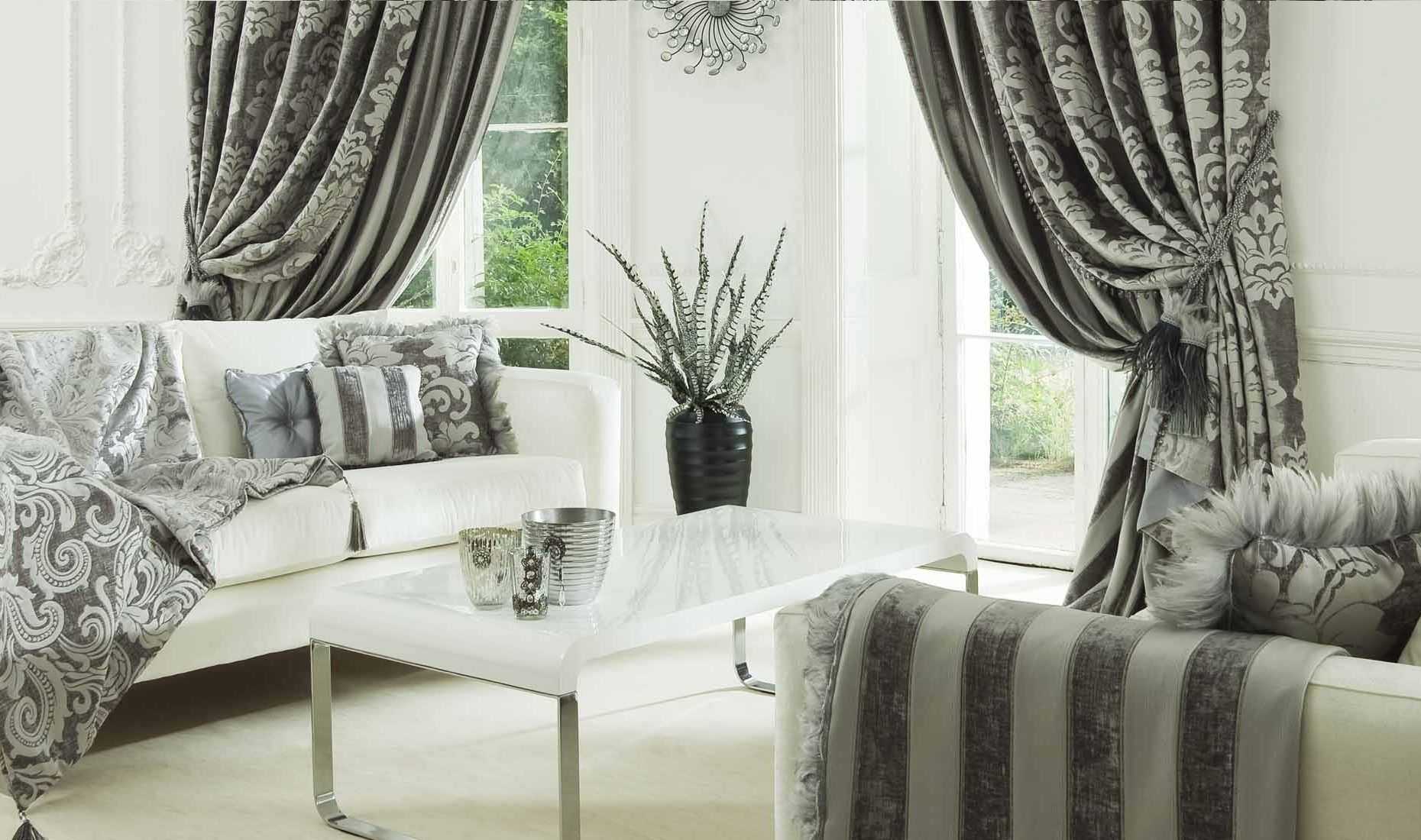 Выигрышно смотрятся шторы с вензелями в интерьере, используемые как дополнение к мягкой мебели с аналогичным орнаментом