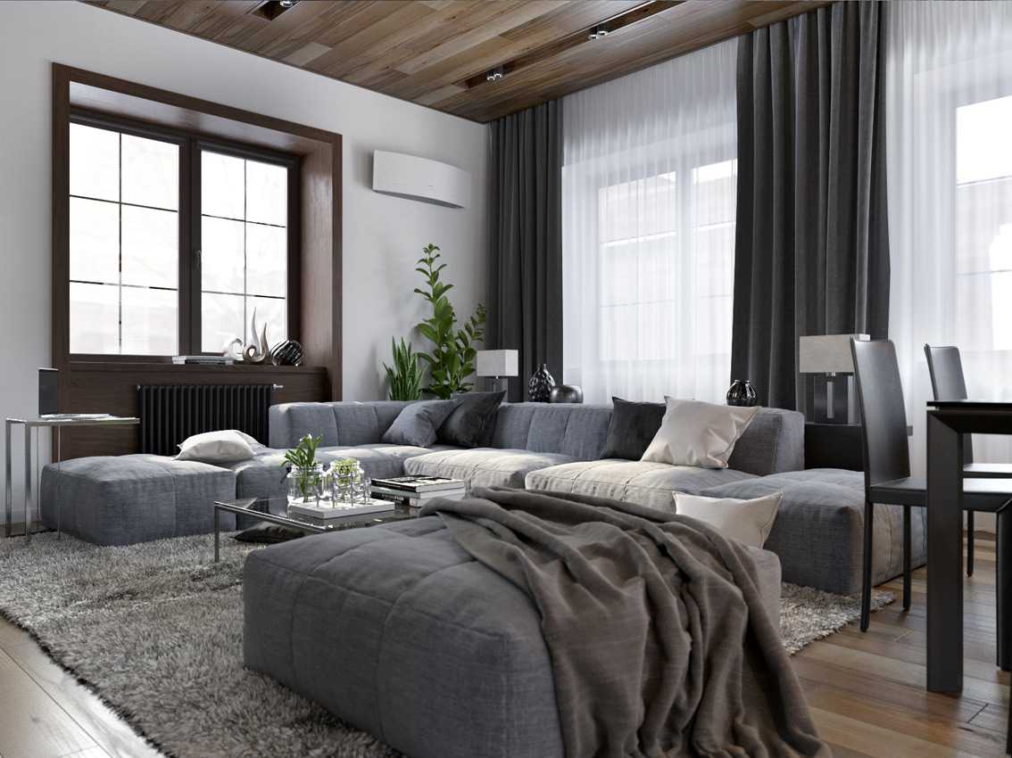 Дополнить лаконичность современной гостиной помогут занавески нейтральных оттенков средней длины. Актуальными в данном случае будут шторы color block. При выборе тюли, предпочтение лучше отдать струящимся, полупрозрачным материалам без бахромы или кружева.
