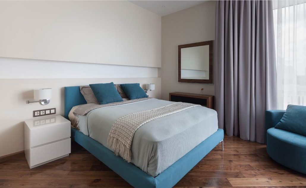 Голубые шторы. Создают мягкую, приятную, успокаивающую атмосферу, а потому хороши в спальне. При желании вы можете разбавить эту голубую дымку подушками и картинами теплых тонов.