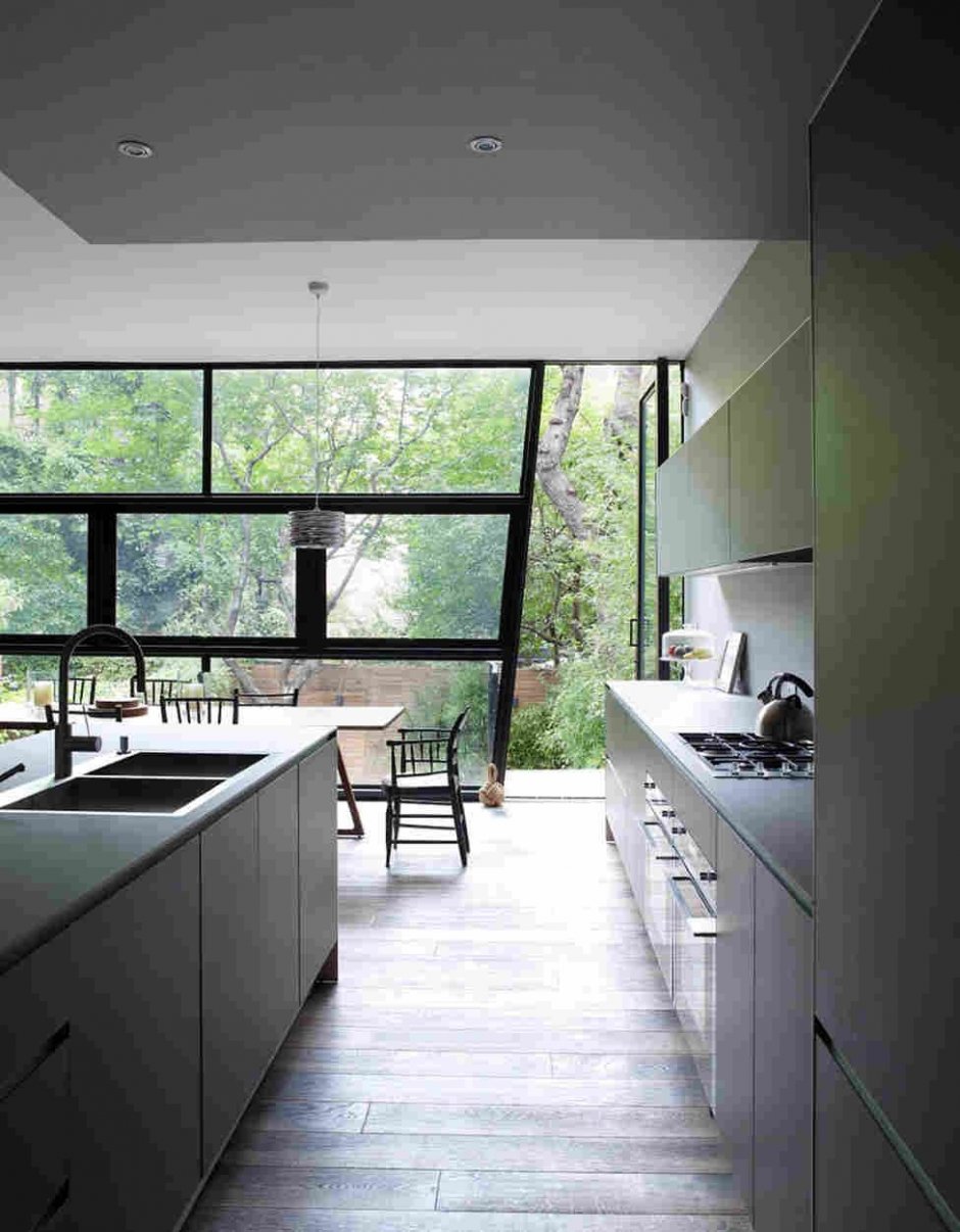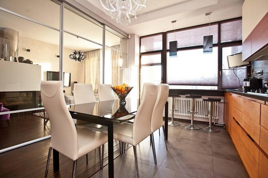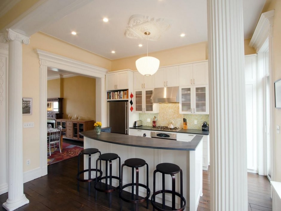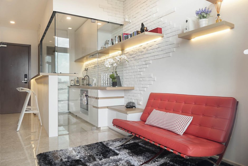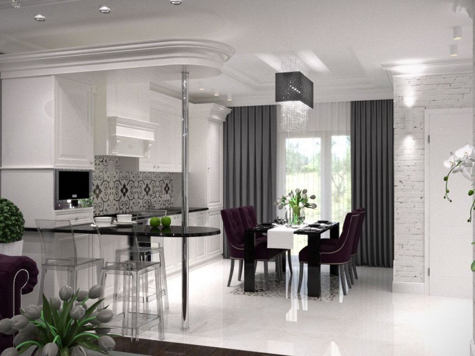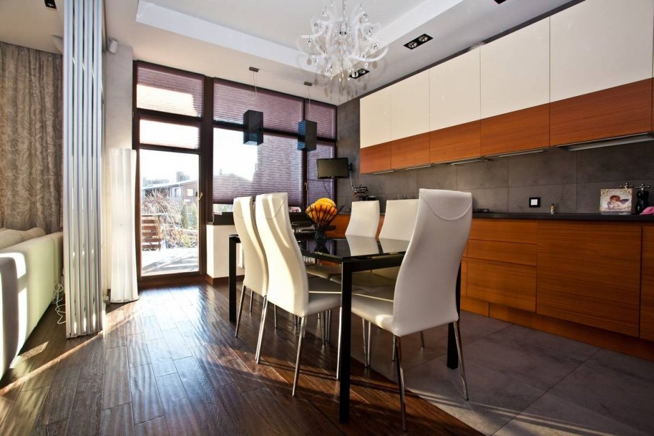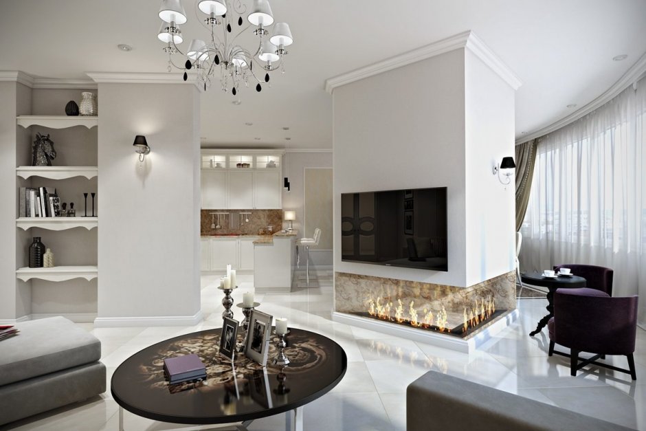 - Частичное зонирование. Отдельная кухня, отдельная гостиная, которые соединяются высокой аркой или любым другим способом, который оставляет открытым взгляду больше, чем оставляет обычная дверь. Хорошее решение для некоторых стилей, которые требуют простора — например, для скандинавского или минимализма.