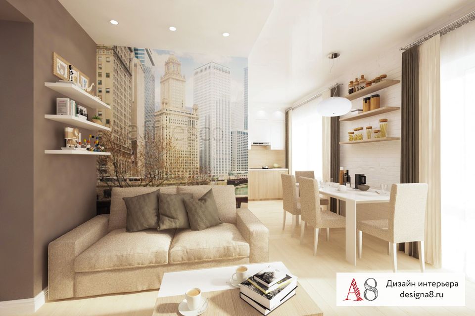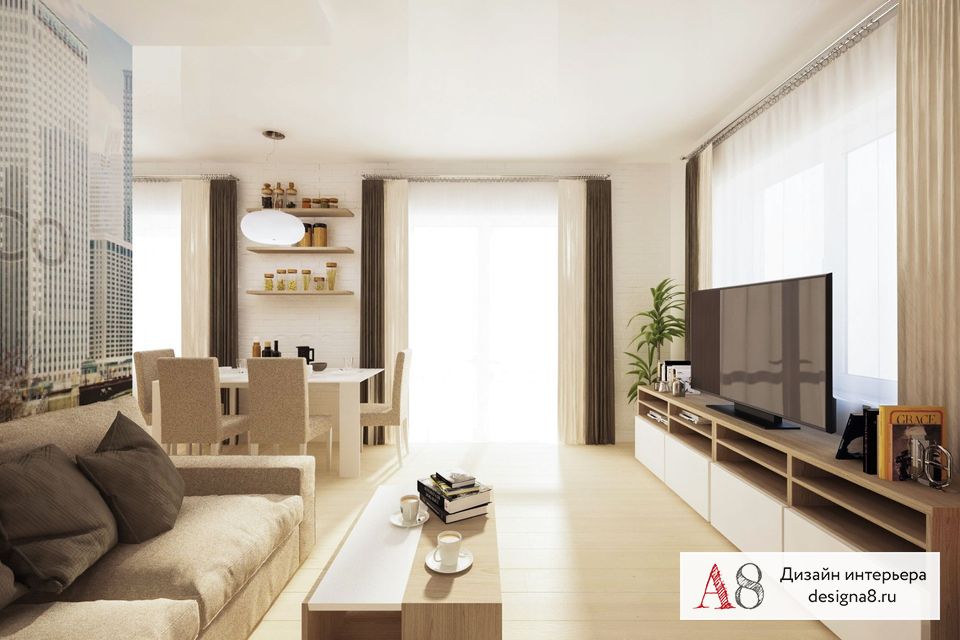 На фото интерьер современной гостиной, объединенной с кухней в 3-х комнатной квартире 70 квадратов.
