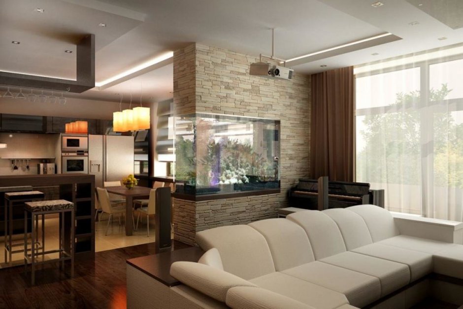 Большое пространство предполагает разделение на несколько функциональных зон, предоставляет возможность создания необычной планировки и применение любого архитектурного стиля, включающего в себя оригинальные отделочные материалы и декор.