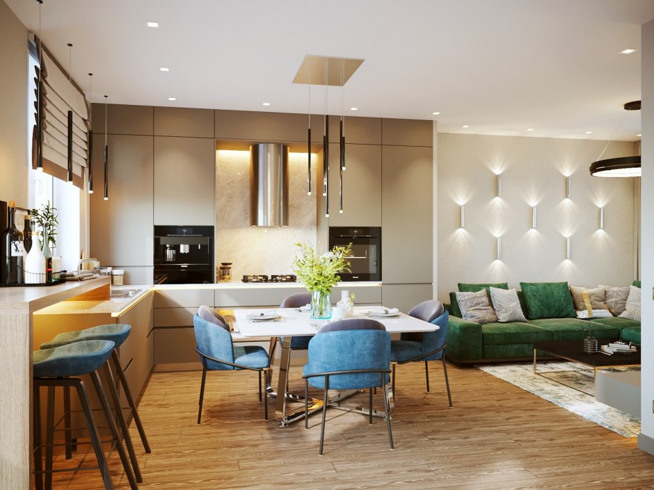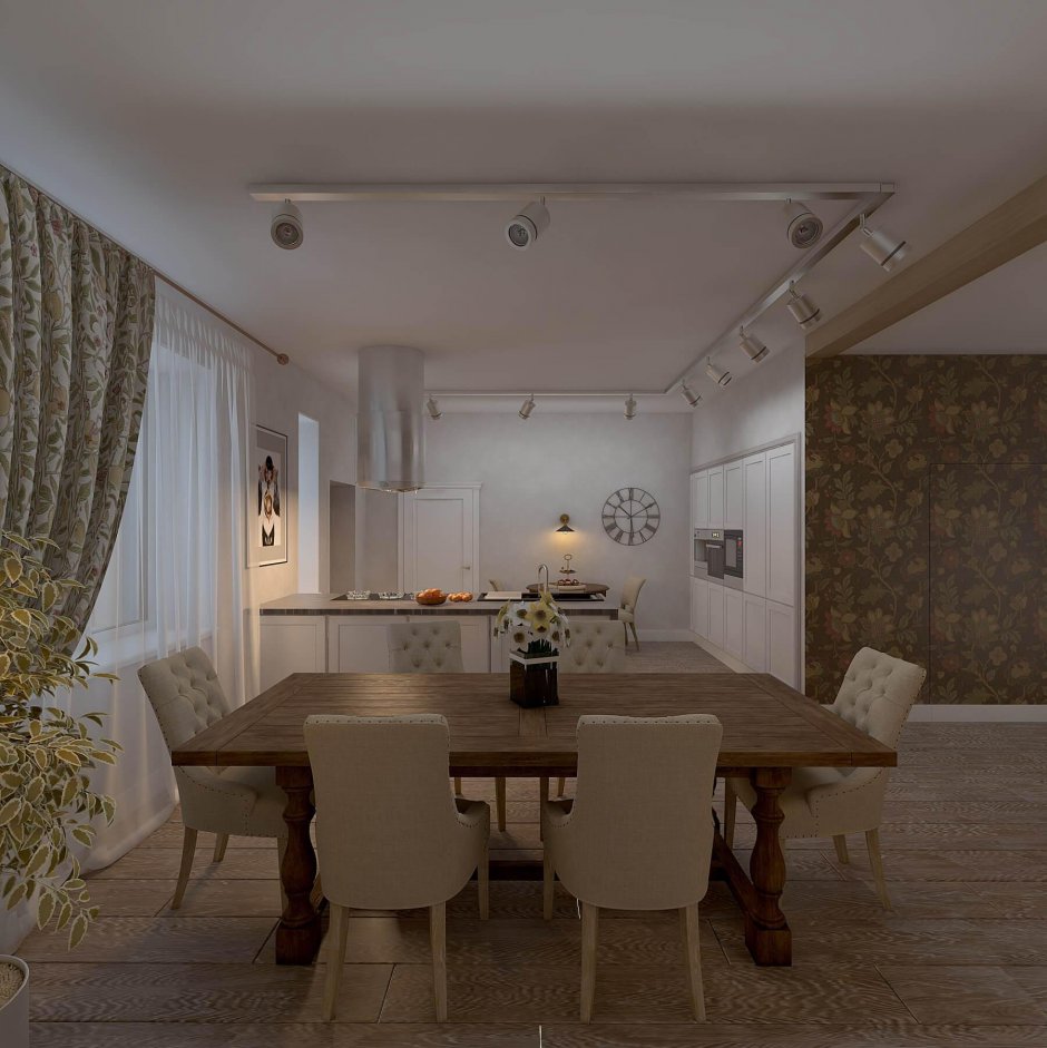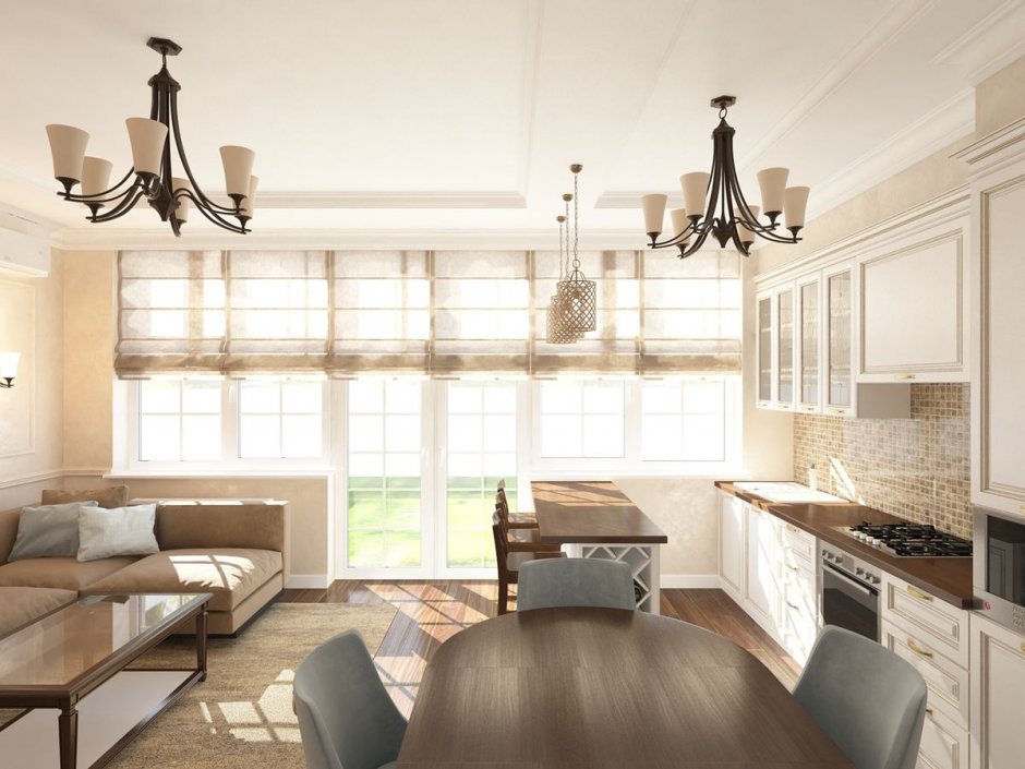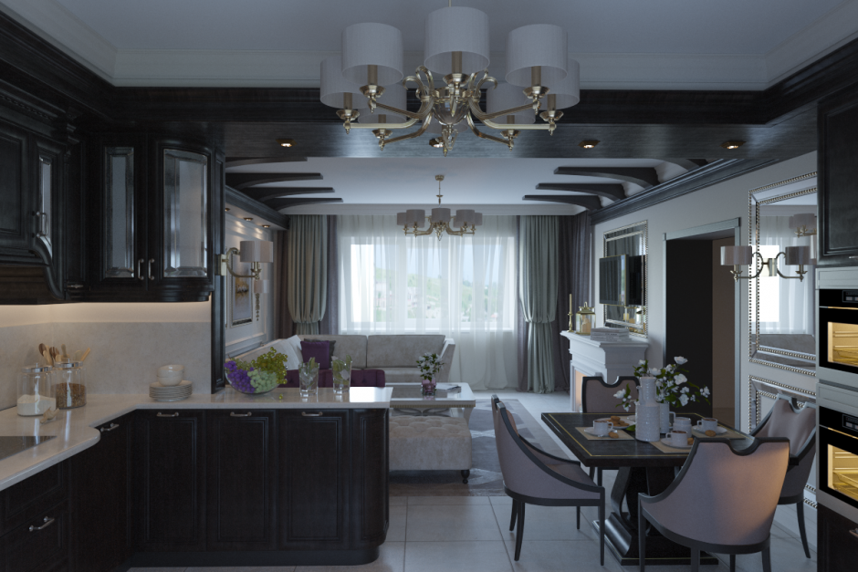 Столовую группу акцентировали люстрой. Главное освещение в комнате обеспечивают встроенные в потолок точечные светильники над диваном и кухонным гарнитуром.