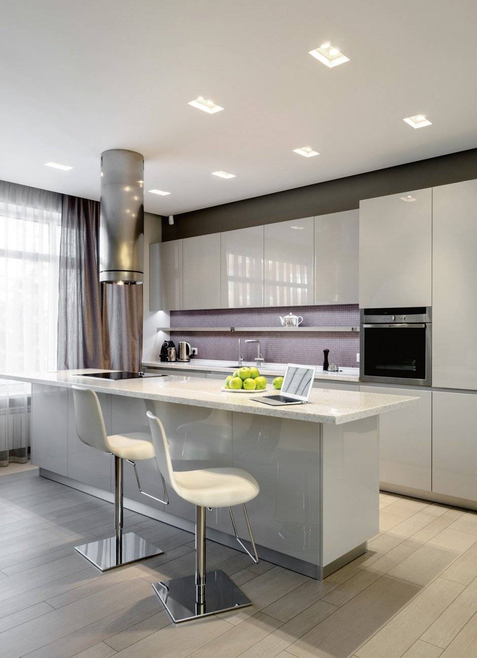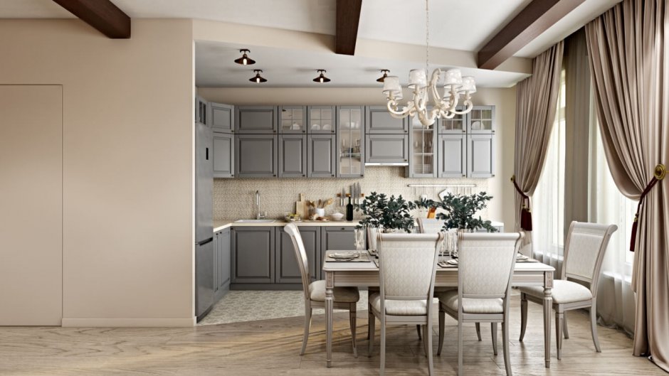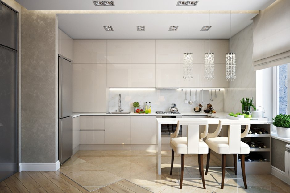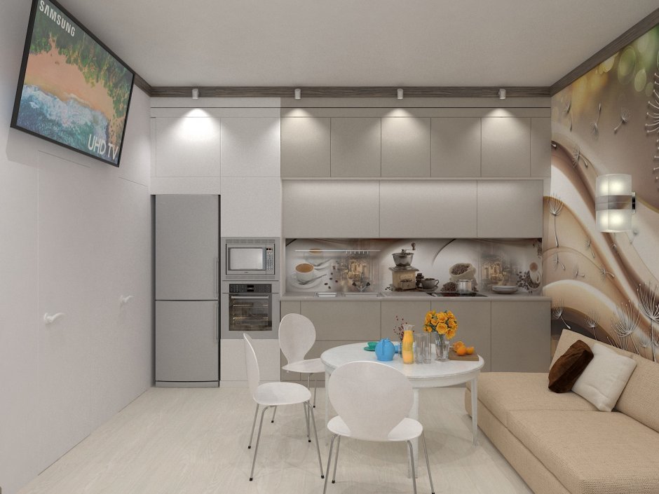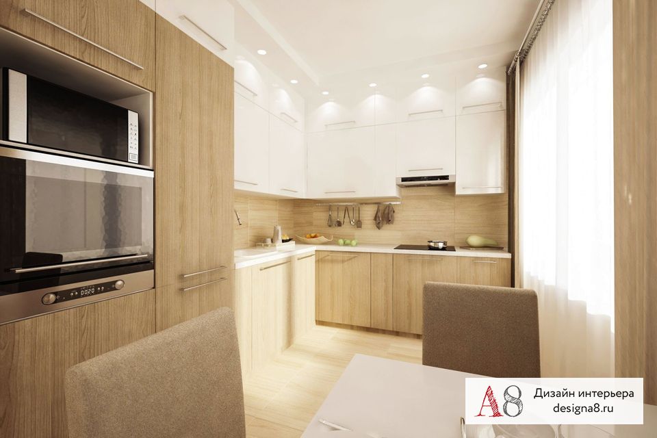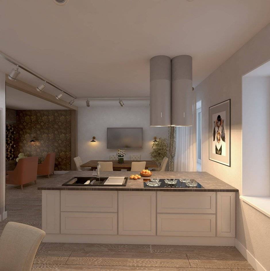 На фото интерьер кухни в светлых тонах в квартире двушке 70 кв. м.