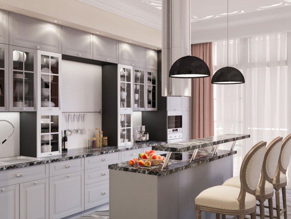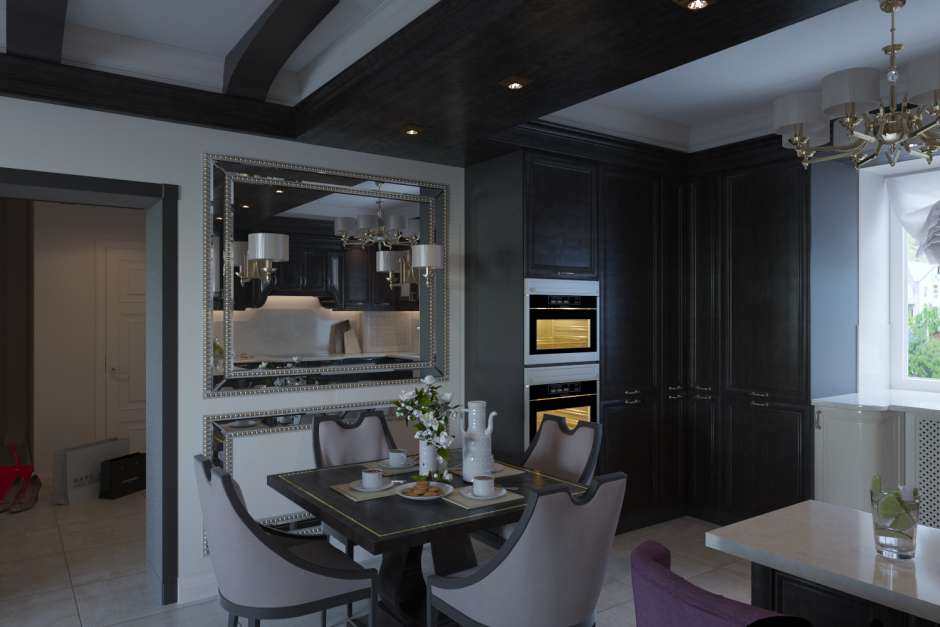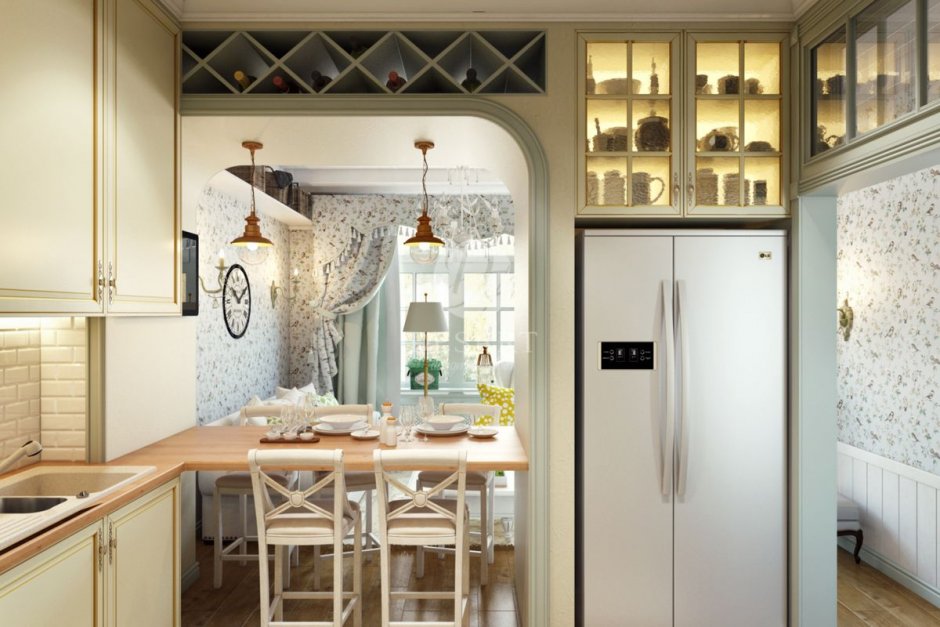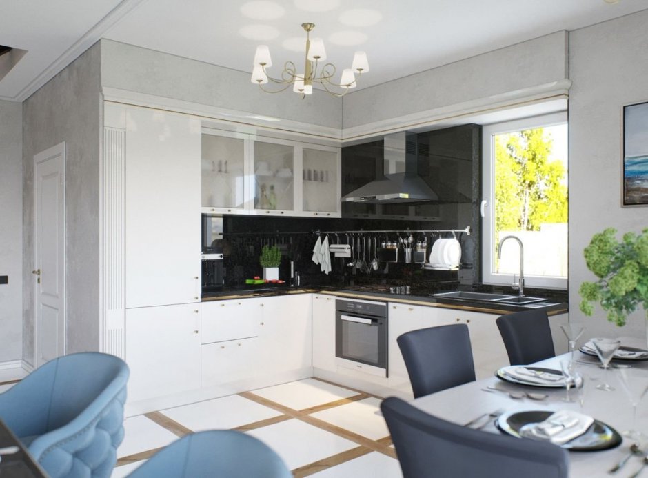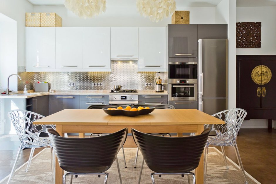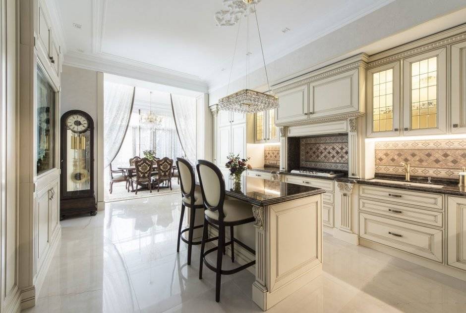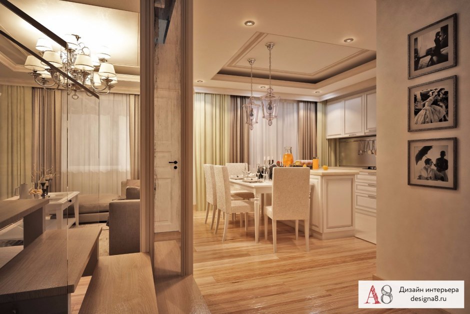 На фото интерьер кухни в светлых тонах в квартире двушке 70 кв. м.