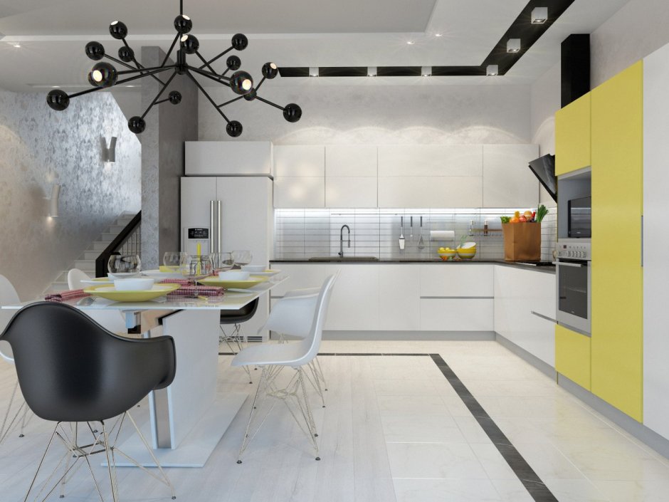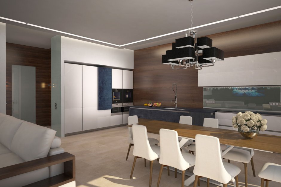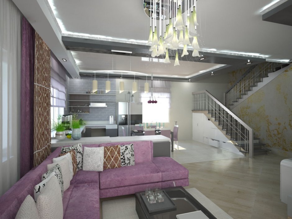 В просторном жилье уместен многоуровневый потолок с оригинальными световыми комбинациями и своеобразное декорирование каждой отдельной зоны с использованием большого количества дизайнерских элементов.