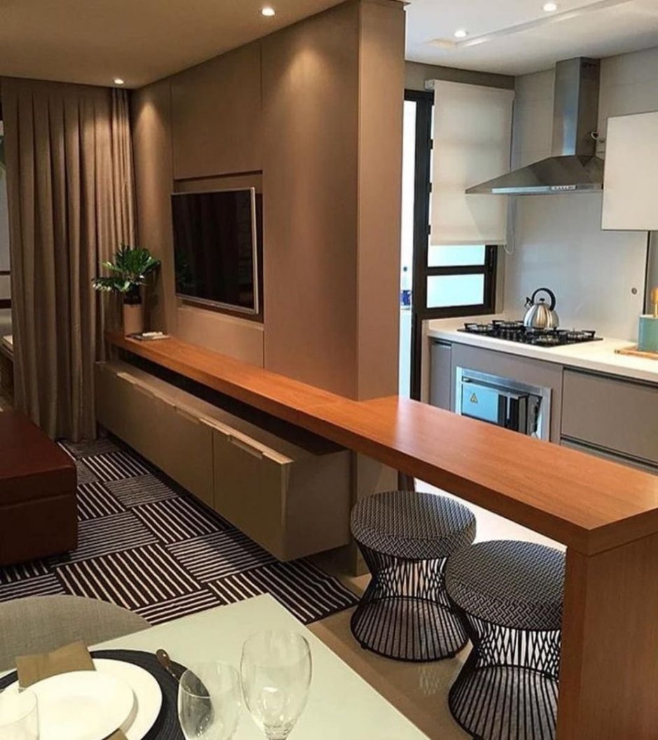 Мебель. Это может быть банально поставленный среди комнаты шкаф, которые разделит её на две половины, а может быть что-то более сложное — от этажерки до двухуровневого стола, одна часть которого будет рабочей кухонной поверхностью, а другая — поверхностью для обеда.