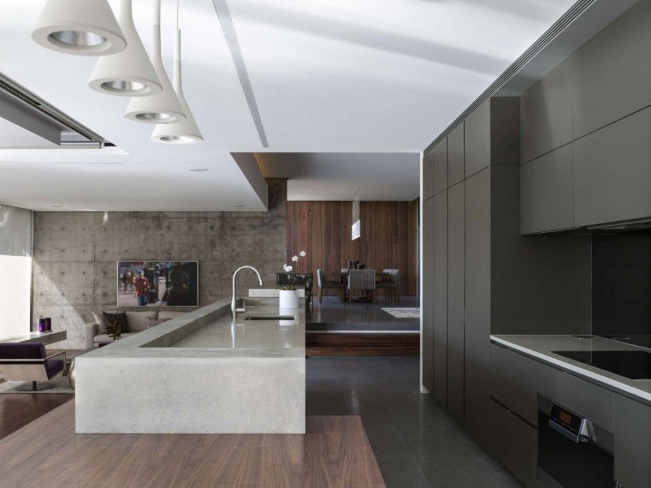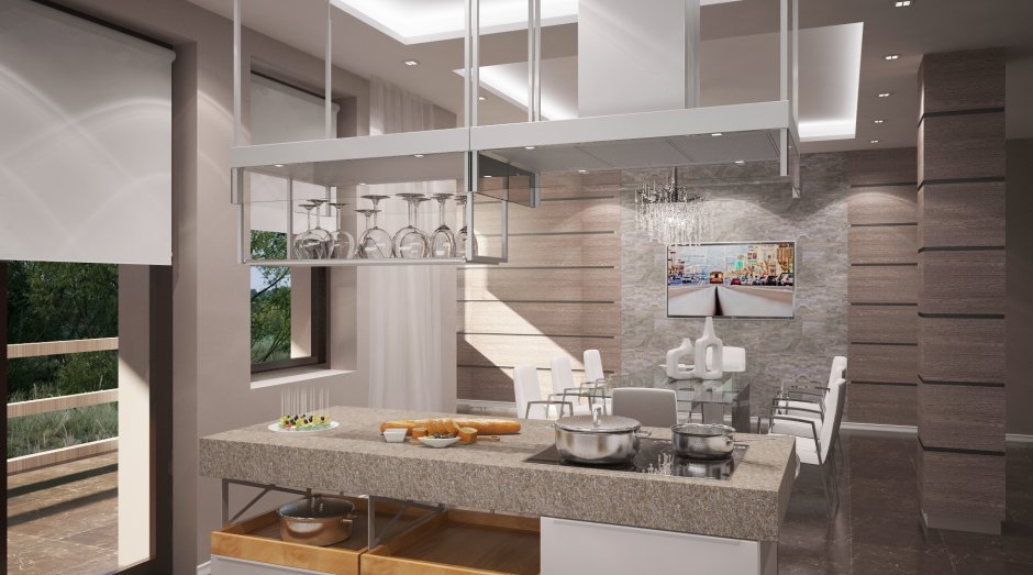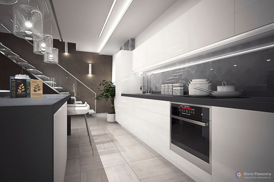 На фото дизайн кухни-гостиной, выполненный в стиле хай-тек в двухкомнатной квартире 70 квадратных метров.