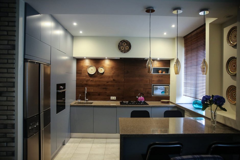 Клиенту понравился напольный керамогранит с текстурой под дерево. Поэтому фартук на кухне также отделали этим кафелем.