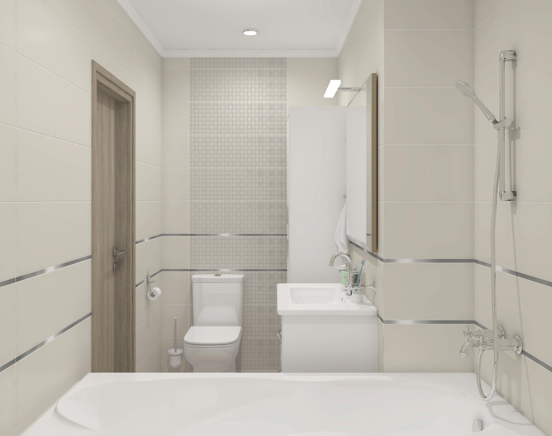 В скромном по размеру помещении отлично будет смотреться кафель серого, светлого голубого и бежевого цветов. Нежелательно использовать вертикальные бордюры, они зрительно принижают потолок.