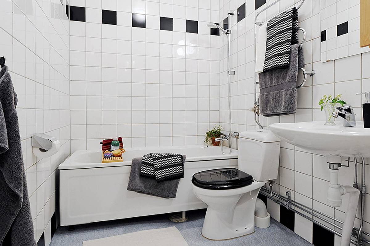 - горизонтальные цветовые акценты при низком потолке ванной;