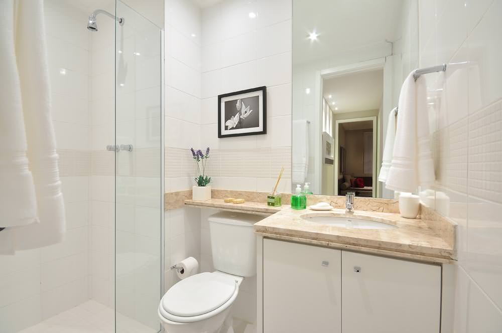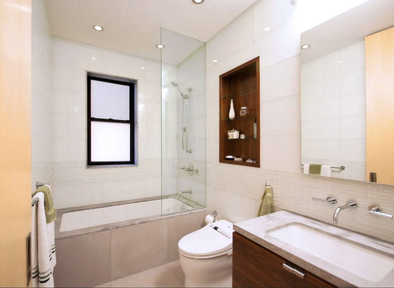 Классическую ванну рекомендуется заменить более компактной душевой кабиной из стекла. Для зонирования пространства можно использовать перегородки из стеклоблоков, пропускающие световые лучи и придающие легкость интерьеру.