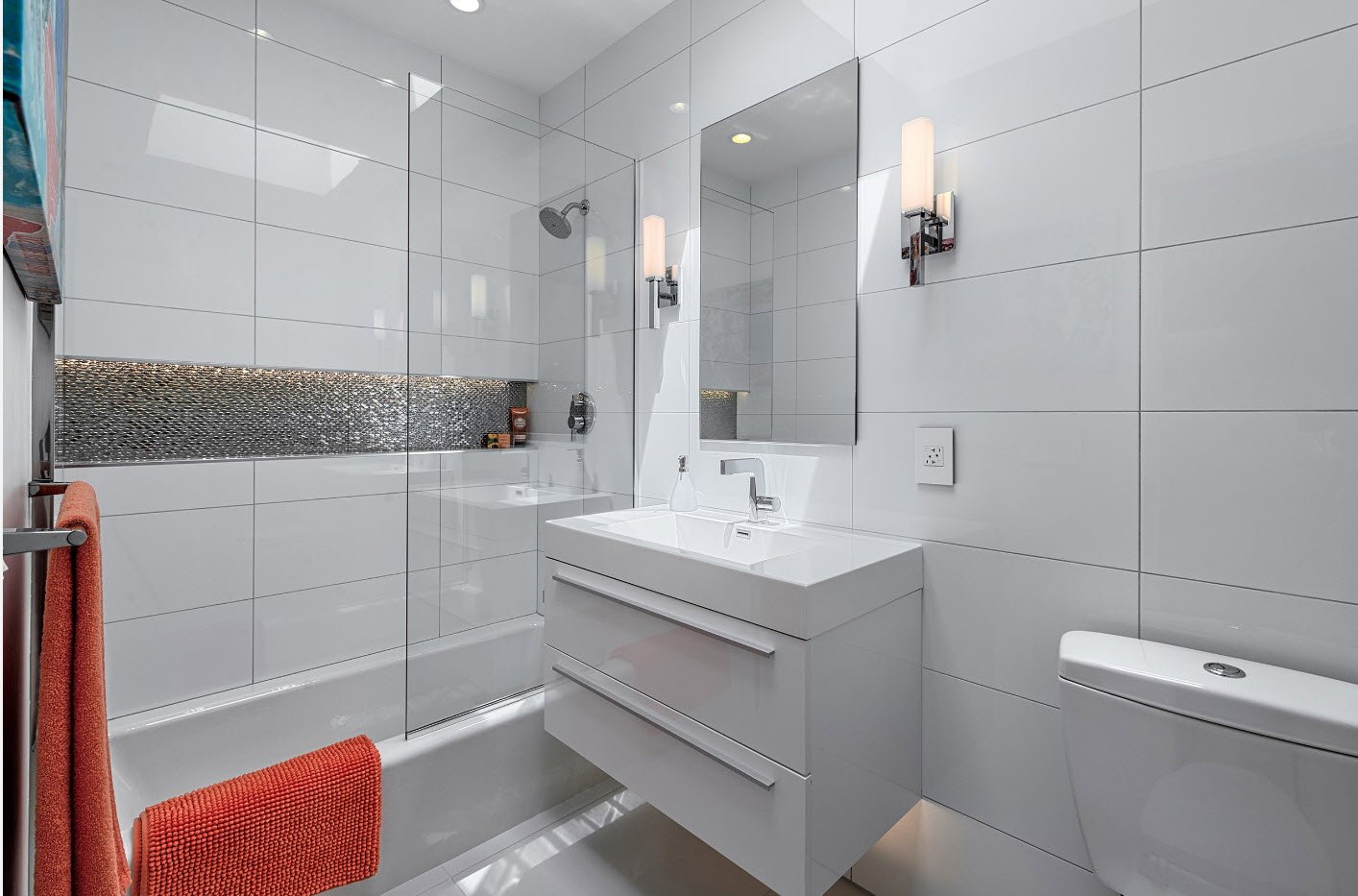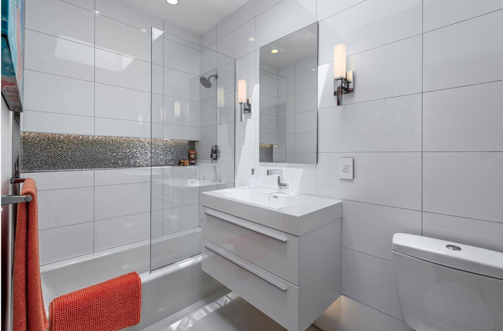 Горизонтальная раскладка визуально увеличивает ширину помещения, вертикальная «приподнимает» потолки. Усилить эффекты помогут вставки-полоски из кафеля контрастного оттенка. Так оформляют все стены или выделяют одну.