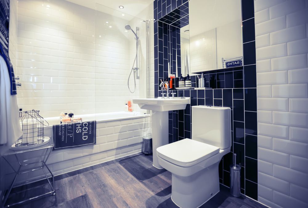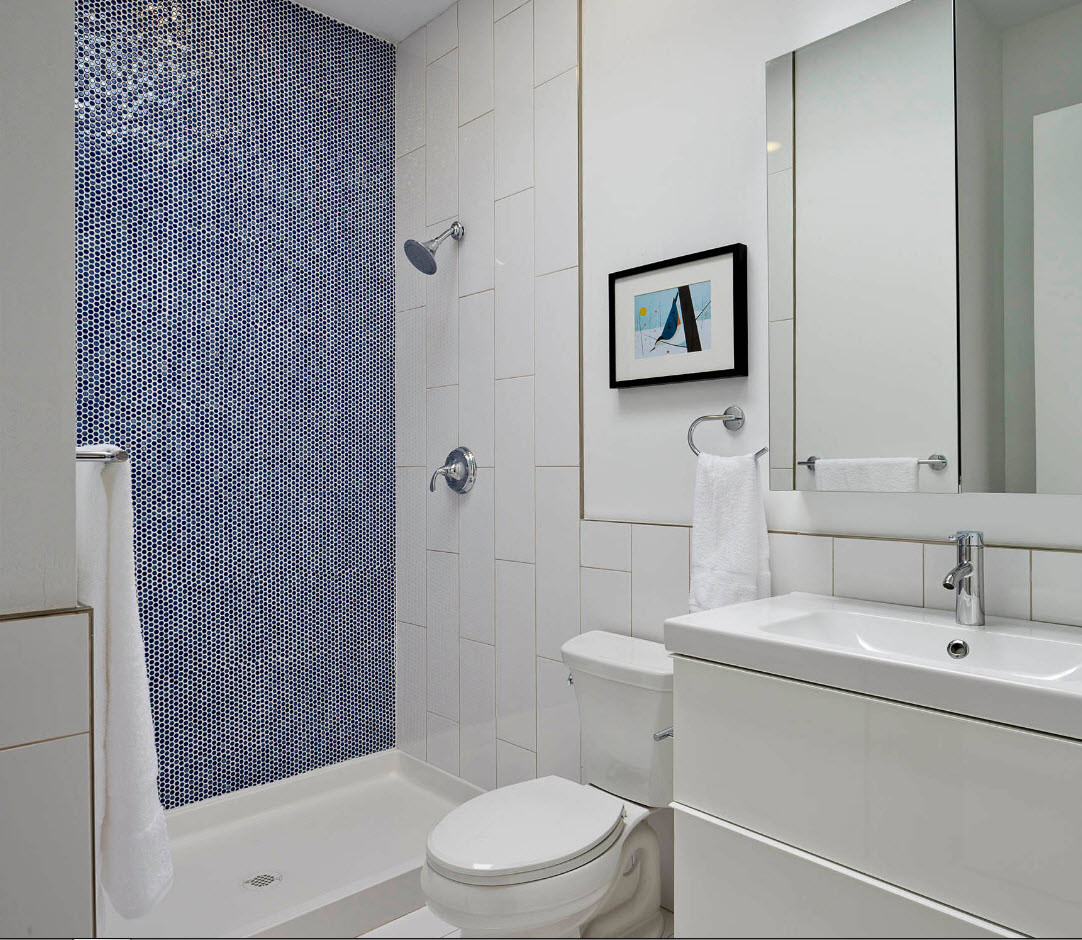 Мелкая плитка или мозаика отлично подойдут для зонирования, т. е. их стоит использовать только для отдельных участков. Например, визуально отделить пространство вокруг раковины или унитаза (если санузел, совмещенный).