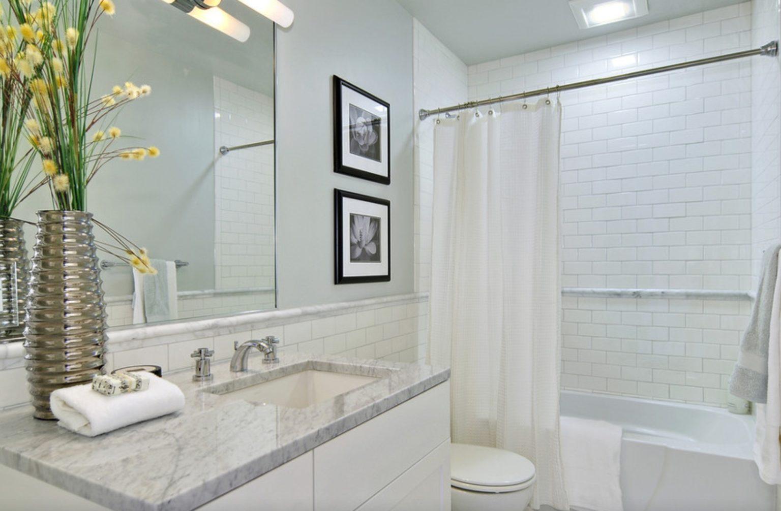 Сбалансировать пропорции скромной по размеру комнаты поможет светлый кафель прямоугольной формы.
