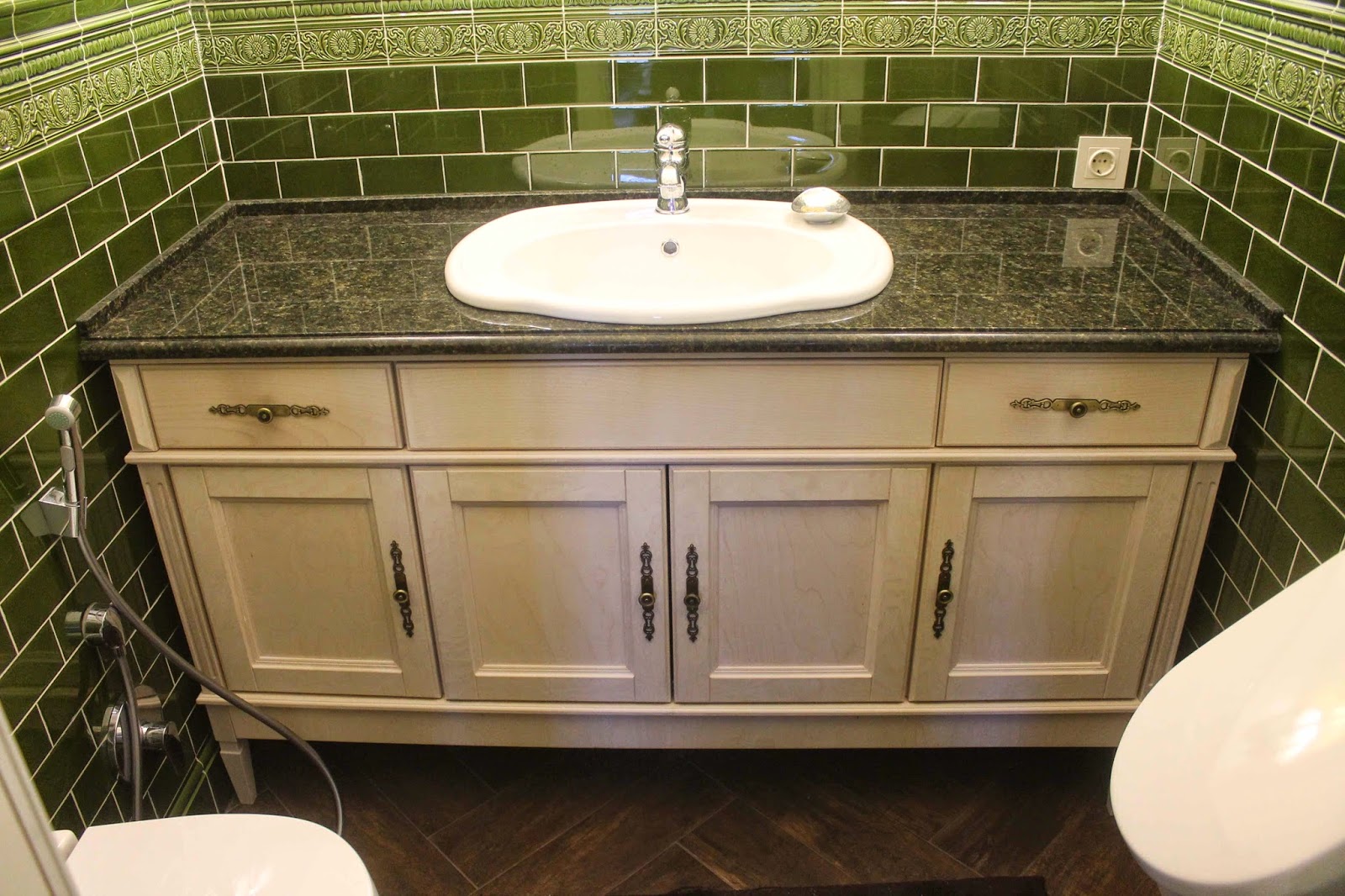 Если убрать часть предметов под столешницу с раковиной, ее уровень станет выше, однако такая планировка способствует размещению дополнительной мебели.