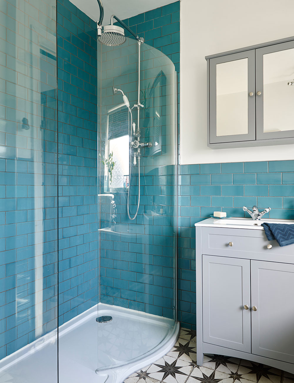 Акцентировать внимание можно на одной из стен или зоне, где находится душевая кабина – ее декорируют в контрастной гамме или выделяют при помощи декоративной плитки с узором