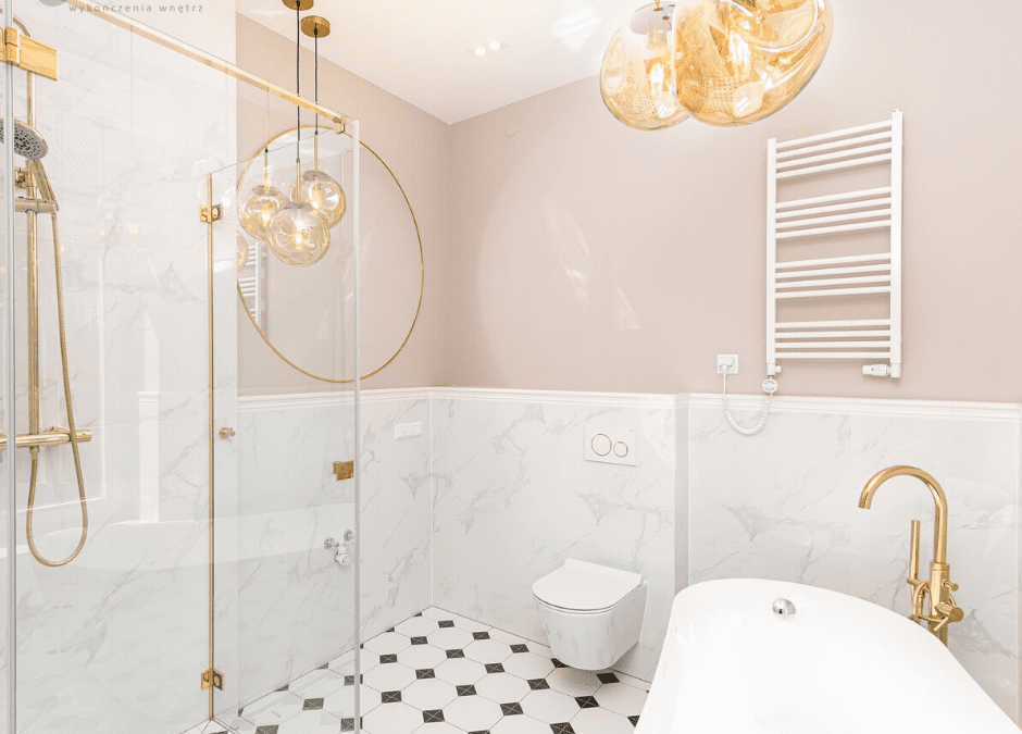 Если у Вас все в порядке с деньгами, можете выполнить отделку плиткой под блестящий мрамор. Подобная схема не зря считается классической — ведь ее любят практически все люди (даже те, кто любит все только новое).