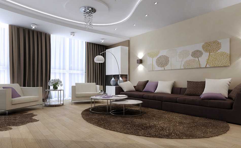 Выполнив отделку гостиной комнаты в тонах «беж» можно получить удачную гамму теплоты и уюта. Современность придают оригинальные сочетания черного цвета и белоснежной палитры.