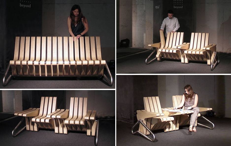 Прекрасная дизайнерская разработка напоминает детский конструктор, но по своей функциональности превосходит всё известное ранее. Это изделие-трансформер может превращаться скамейку, набор кресел со стульями или стол.