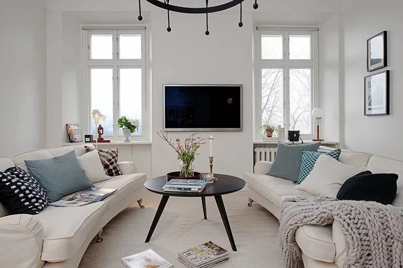 Подобное расположение окон затрудняет возможность выбора и расстановки мебели в гостиной с двумя окнами, однако его можно удачно обыграть в интерьере.