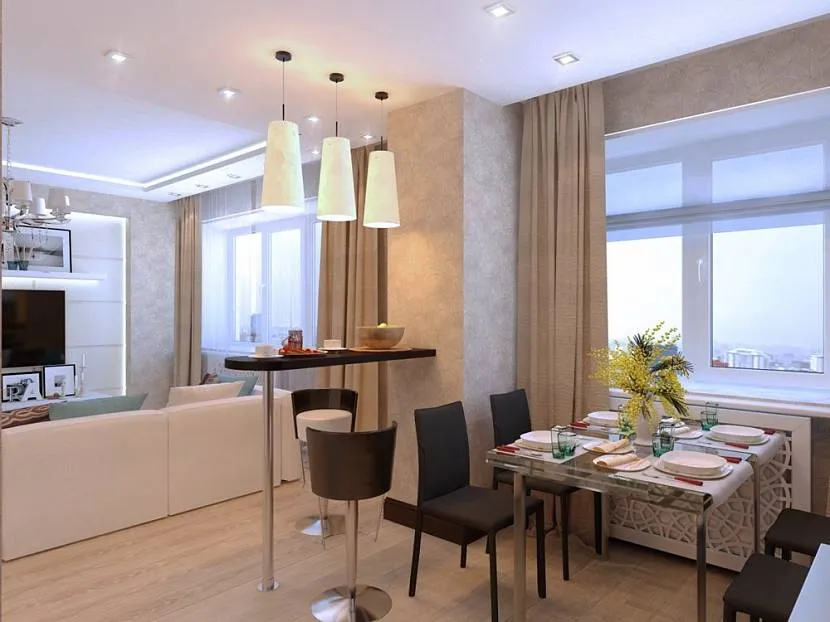 Если гостиная с двумя большими окнами совмещается с кухней, то между двумя зонами можно установить обеденный уголок или барную стойку, которая служит комфортной обеденной зоной и удобна для дружеских посиделок.