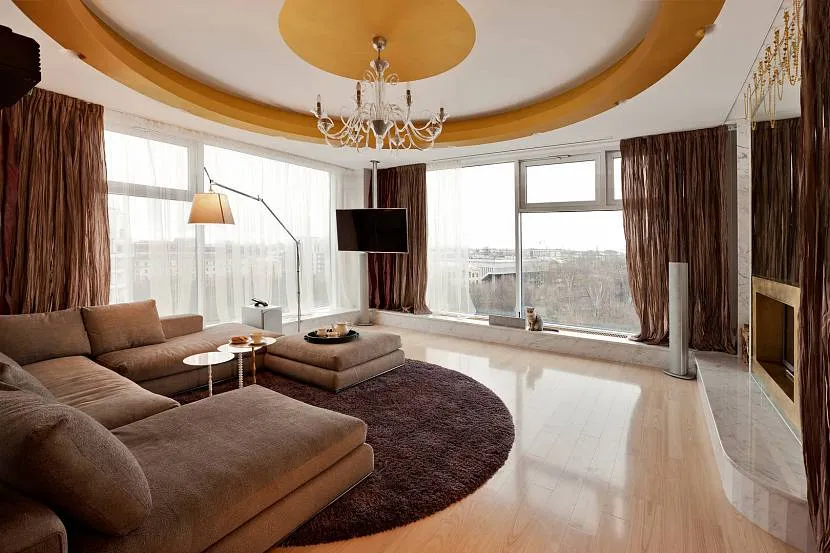 Самая распространенная цветовая гамма для зала — это светлые тона. Это не удивительно: бежевые, песочный,коричневый создают ощущение обволакивающего комфорта и расслабления. Такие цвета располагают к отдыху после долгого трудового дня. Вопрос с маркостью можно решить с помощью более темной обивки дивана и другой мягкой мебели. Отлично подойдут глубокий синий, изумрудный, бордовый, шоколадный.
