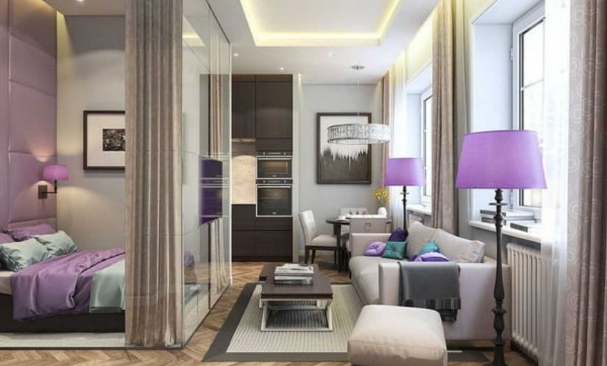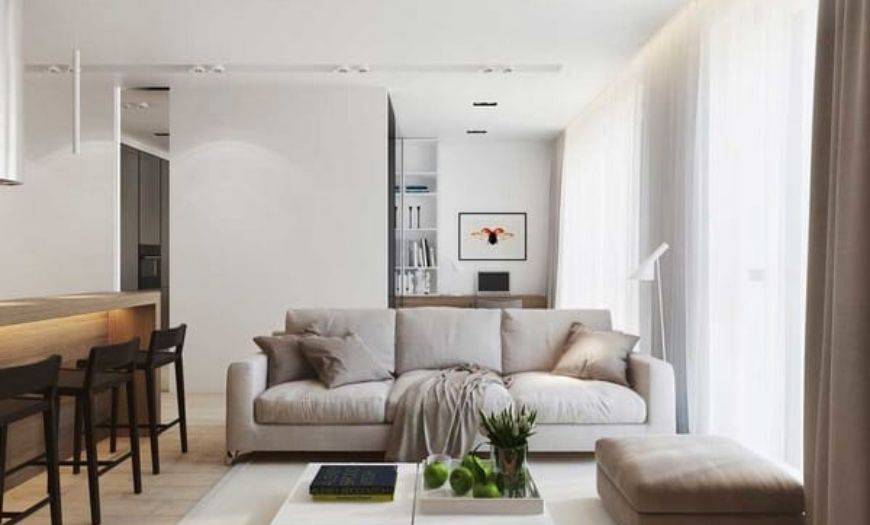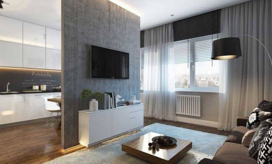 Расширить пространство гостиной в двухкомнатной квартире поможет физическое объединение комнат. Так вы получите одну большую площадь с двумя окнами. Другой вариант – сделать квартиру-студию путем совмещения кухни и гостиной.