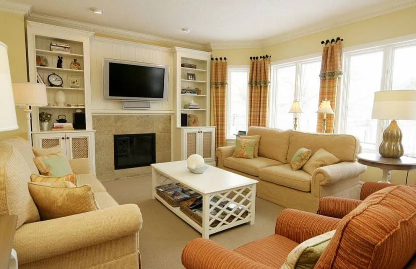 Классический вариант при большой площади – в центре гостиной размещают журнальный столик, вокруг которого располагают диваны и кресла.