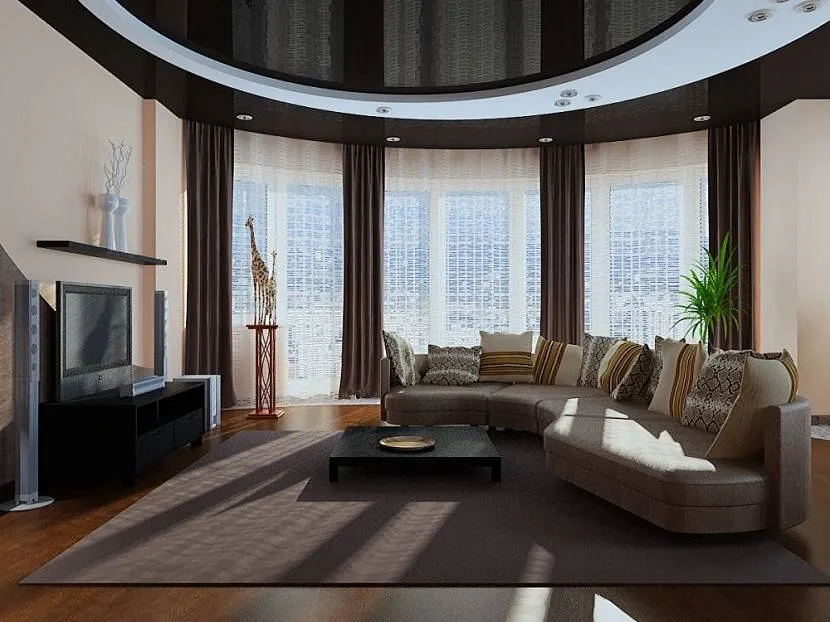 Стильно смотрится диван, поставленный напротив окон, тогда в простенке можно разместить домашний кинотеатр, стену над ним украшают картиной или большой фотографией.