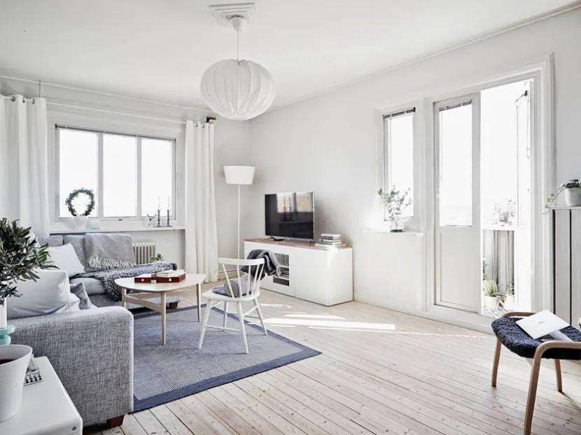 Гостиная в скандинавском стиле – очень много света и простораБелый цвет «скандинавии» лучше разбавлять яркими акцентамиЭкогостинаяГостиная, совмещённая с кухней в экостиле