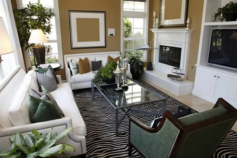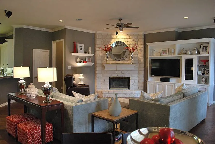 Главным украшением дизайна гостиной станет каминный портал. Его отделывают с помощью камня, мозаики, кирпича, гипсокартона, дерева или гипсовой лепнины. Полку над очагом украшают всевозможными аксессуарами и декоративными элементами.