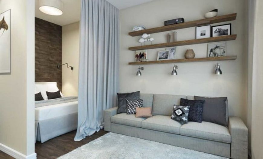 Отдельное помещение с одной дверью – распространенный вариант в типовых проектах. Но что делать с малогабаритной квартирой, где единственная большая комната – гостиная на 19-20 «квадратов», но она проходная. Такое помещение сложно оборудовать как полноценную супружескую спальню, даже если гостей принято принимать и здесь, и в хорошо оборудованной кухне.
