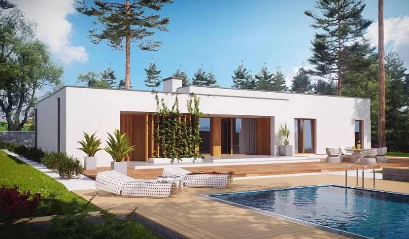 Одноэтажный белый дом с прямой крышейИсточник roomester.ru