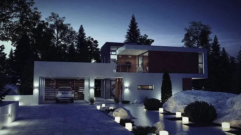 Стильный дом в стиле хай-тек с подсветкой всего фасада