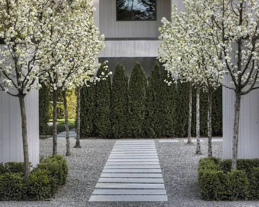 Дорожки. От них требуется идеальная ровная поверхность и аккуратные границы, а вот форма может быть разной. Материалом служит гладкая бетонная плитка, керамогранит, отсыпка белым или цветным гравием, садовый паркет из ДПК (древесно-полимерного композита).