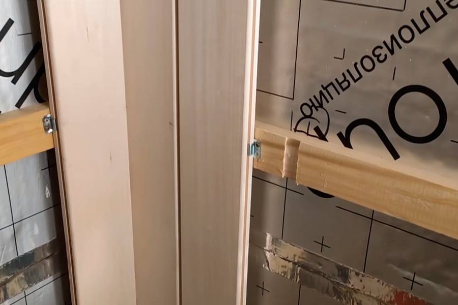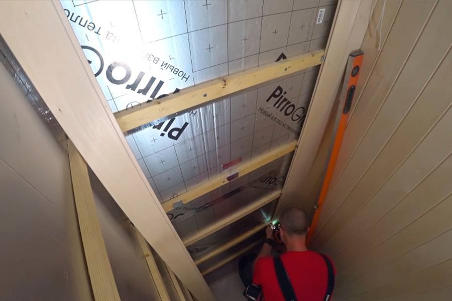 Устанавливается входная дверь. Укладывается пароизоляция, для это используется пергамин или иной соответствующий этим целям материал. Во внутреннее пространство каркаса закладывается утеплитель (минеральная вата или пенопласт). Выполняется отделка внутреннего пространства сауны. Для этого используется вагонка или пиломатериал с высокой степенью обработки (строганый, без сколов и повреждений). Крепление каркаса к стене выполняется при помощи анкерных болтов, а элементов каркаса между собой – саморезами с использованием монтажных уголков и пластин. Выполняется установка вентиляционной решетки и соединение ее с системой вентиляции помещения в месте установки сауны. Устанавливается электрическая печь