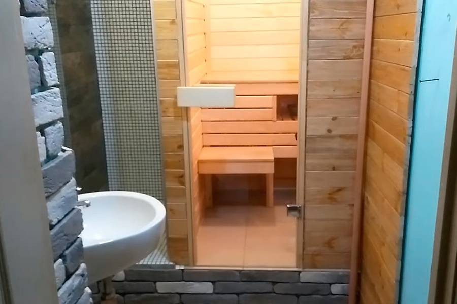 Помещение под сауну должно быть не менее 1,8×2 м. Это позволит без труда разместить в нем лежанку. Такая мини-сауна станет удобным и практичным решением для квартиры.
