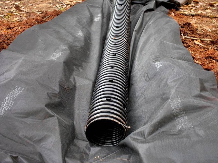 Чтобы защитить перфорированные элементы дренов от засора широко используют геоткань. При ее наличии становится возможным монтаж дренажной системы на песчаной и суглинистой почве.