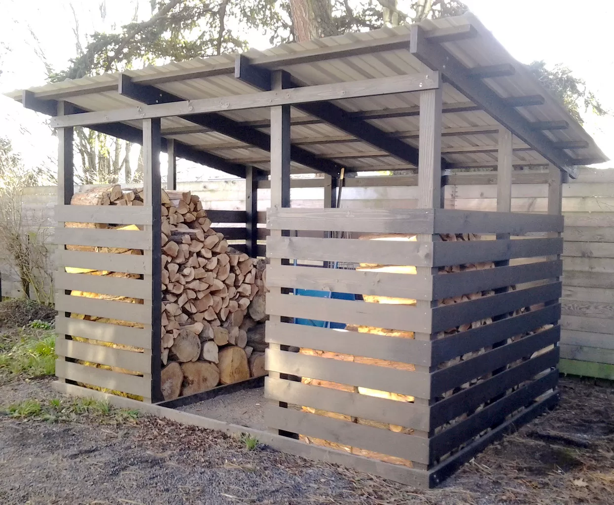 Вот вариант брутального дровника. Неказистый, в сугубо деревенском стиле, без всякого дизайна, но задачу свою выполняет.