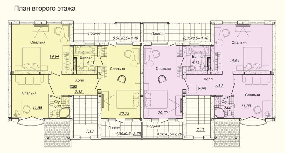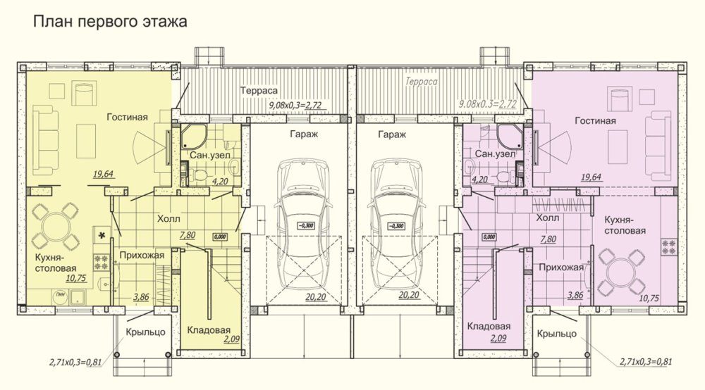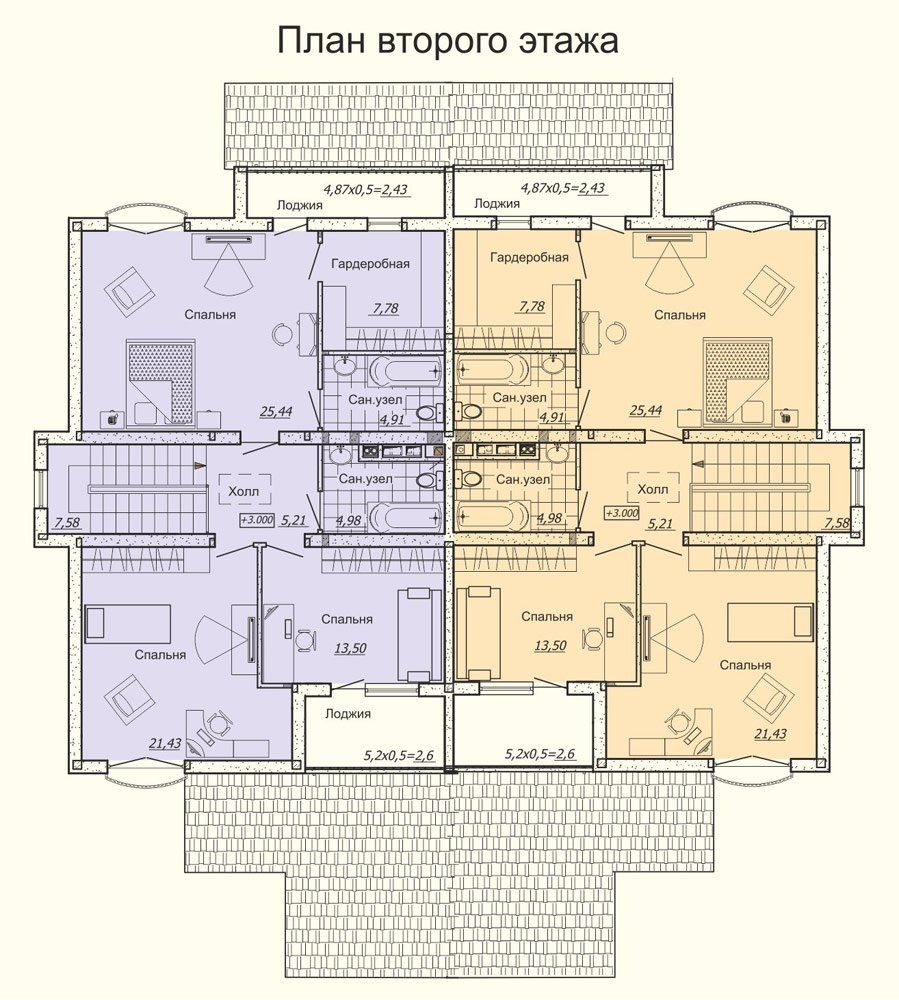В домах на 2 семьи зачастую строится общая котельная, что позволяет сэкономить небольшое количество площади. Коридор достаточно просторный, поэтому может выступать в качестве продолжения гостиной.