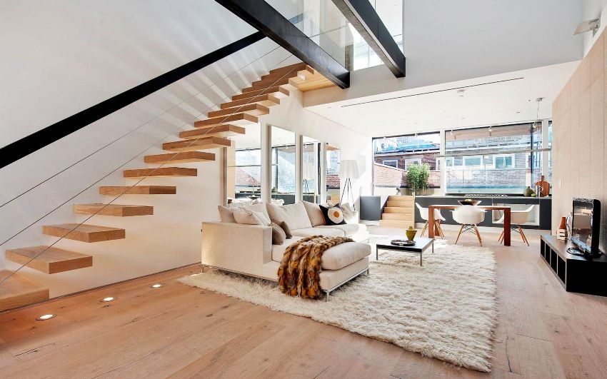 Особое внимание уделяется отделке лестницы, которая является одним из главных и необходимых элементов многоуровневого таунхауса. Оформление элемента должно гармонично сочетаться с общим дизайном интерьера дома