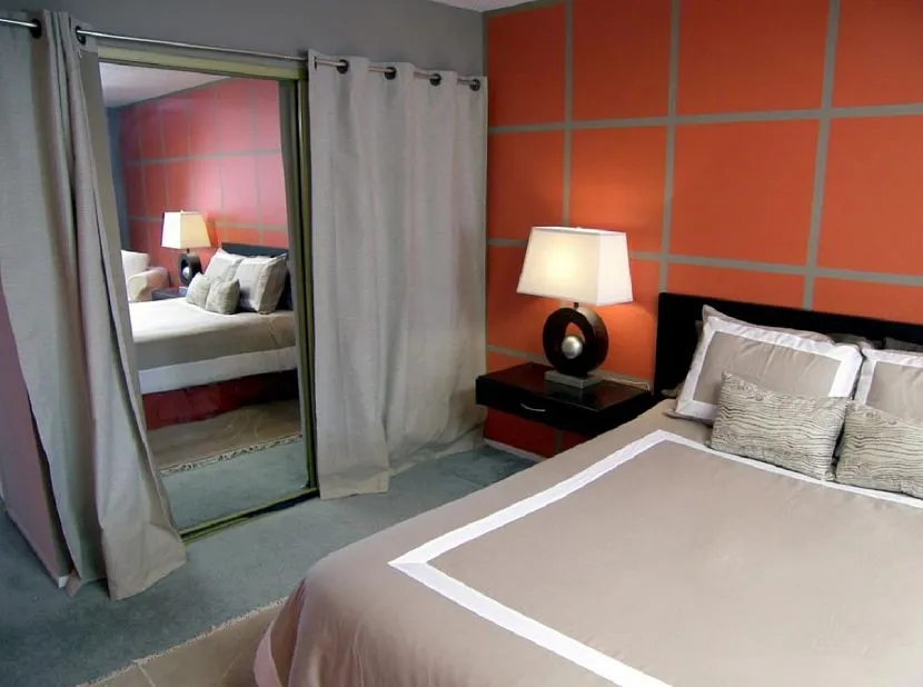 Неплохо будет смотреться и драпировка на стене из красивой ткани, которая закроет одну половину двери. Этот прием в свою очередь поможет нейтрализовать негативные последствия от места расположения зеркала.