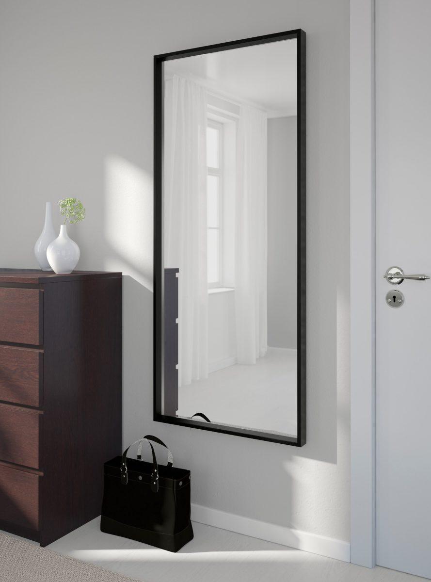 Зеркало небольшой ширины (от 30 см) займёт своё место на узком простенке, позволит эффективно использовать площадь коридора. Оно выглядит элегантно и скромно, не требует вычурного дизайна. За счёт длины предоставляет отражение в полный рост.